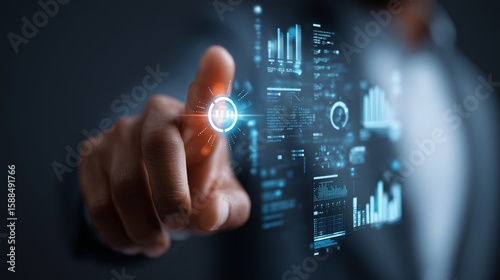 Businessman touching a digital AI icon with floating data analytics and charts innovation and technology concept