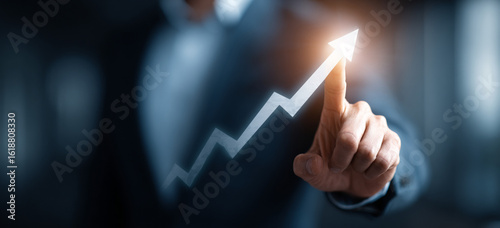 Businessman touching a glowing upward arrow graph symbolizing business growth, success, and financial progress