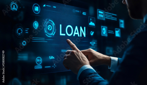 Businessman touching a transparent screen with the word LOAN and business success icons on a virtual background, a concept of a financial package or marketing offering in a vibrant color, photo shoot