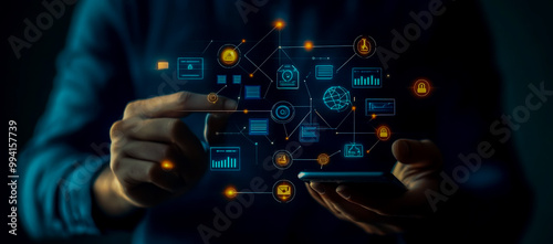 Businessman touching a virtual screen with digital icons and data on a blue background, a business technology concept.