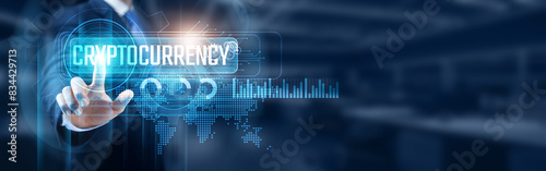 Businessman touching cryptocurrency network connection, data transfer and blockchain integration, innovation and financial concept.