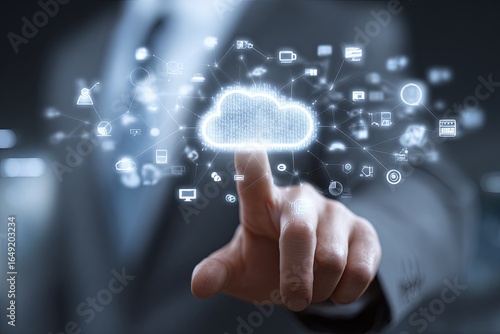 Businessman Touching Digital Cloud Technology Interface with Icons and Data Connections in Modern Workspace