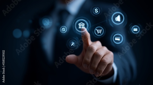 Businessman touching icon online banking and icon network connection, online payments, shopping and digital technology business on virtual screen dark blue background