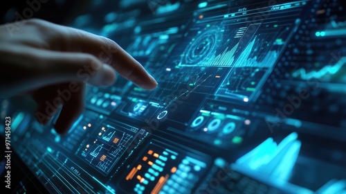 Businessman touching on digital screen with stock market graph and chart background,
