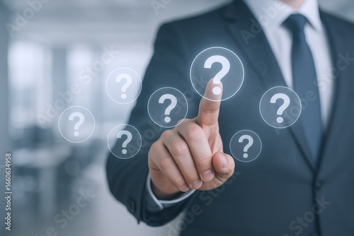 Businessman Touching Question Mark Icon on Virtual Screen Representing Solutions, Assistance, and Information