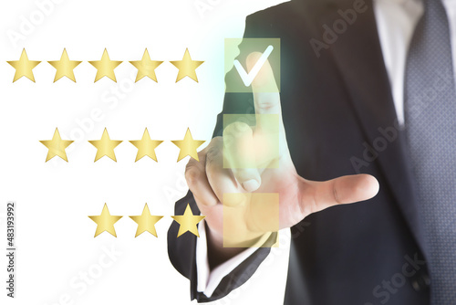 Businessman touching virtual screen on satisfaction rating icon in customer service and satisfaction concept. to give a good rating on the service That rating is a star icon.