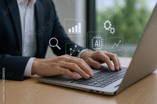 Businessman Typing on Laptop with Artificial Intelligence Interface Displaying Business Analytics and Data Visualizations