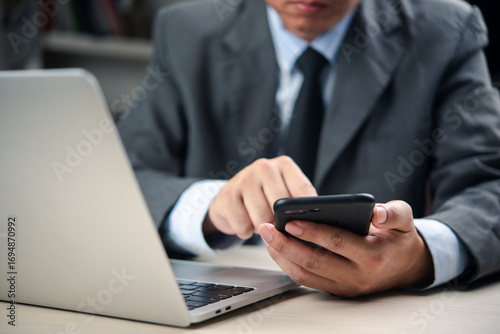 businessman uses a smartphone, laptop computer at an office desk to manage online communication, schedule meetings, and boost productivity. concept mobile digital workflow.