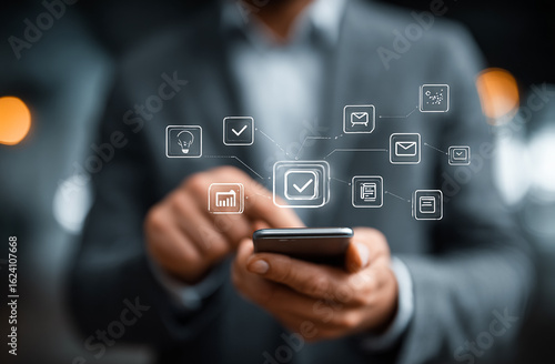 Businessman uses smartphone, checks digital icons. Concept: mobile technology, business efficiency, social media, multitasking. For marketing, web, advertising.