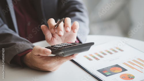 Businessman using a calculator to calculate numbers on a company's financial documents, he is analyzing historical financial data to plan how to grow the company. Financial concept.