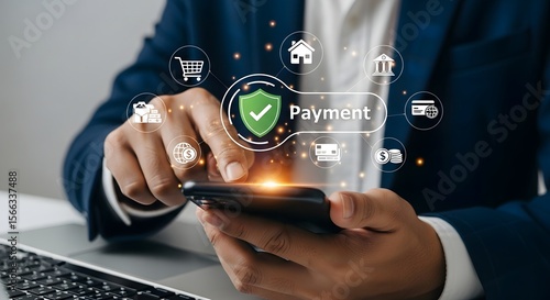 Businessman using a smartphone for secure online payment, surrounded by digital icons.