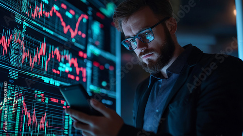 Businessman using a smartphone to monitor stock prices modern portrait investment graph background financial data