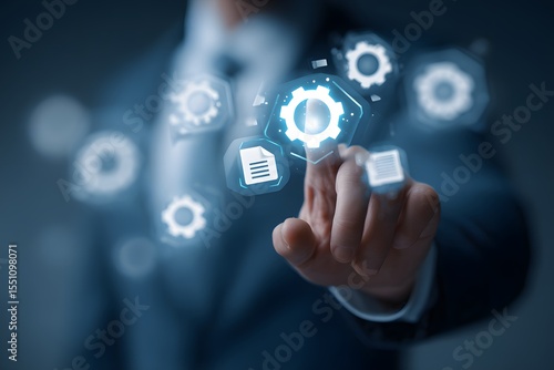 Businessman using an AI-powered Document Management System (DMS) for efficient file organization. Illustration.