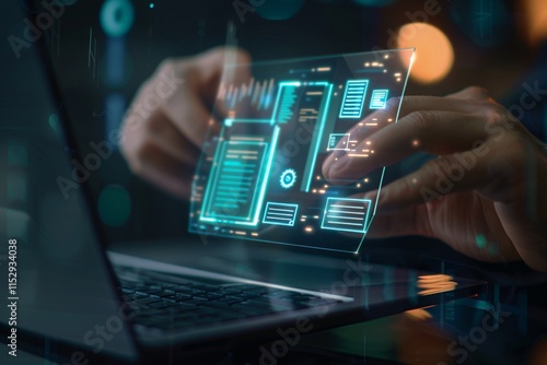 Businessman using digital hologram documents and records in front of the laptop