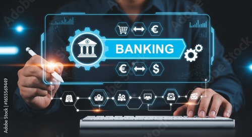 Businessman Using Digital Stylus with Futuristic Banking Holographic Interface – Fintech and Cyber Security Concept