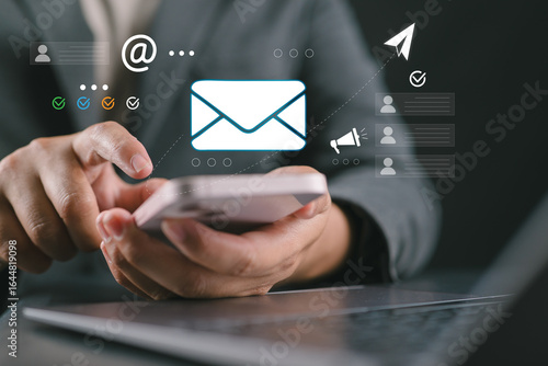 Businessman using email marketing tools on laptop and smartphone, sending newsletters and analyzing campaign performance to engage subscribers and grow business through personalized content