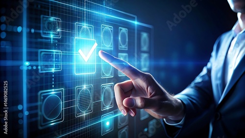 Businessman using futuristic technology interface selecting digital checkmark approval process for efficient workflow and data management.