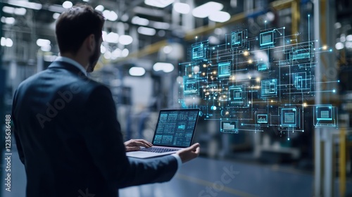 Businessman Using Laptop with Holographic Data in Industrial Factory