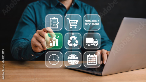 Businessman using laptop with sustainable procurement icons for eco-friendly business solutions