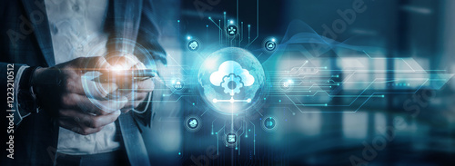 Businessman using mobile devices to interact with Platform as a Service, global network connectivity, and cloud-based solutions.