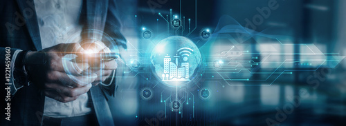 Businessman using mobile devices to interact with Smart City technologies, global network connectivity, Smart City infrastructure, and services.