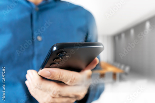 Businessman using mobile phone to read messages and touch the mobile screen to work through mobile phone.