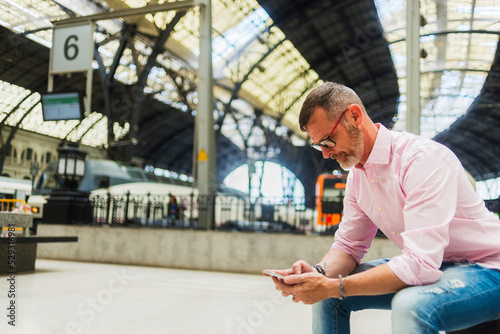 Businessman using smart phone while sitting at railroad station platform