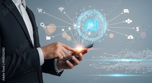 Businessman Using Smartphone with AI Hologram Overlay - Digital Innovation and Technology Concept