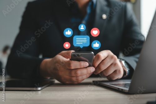 Businessman using smartphone with floating social media interaction icons, digital marketing and online presence through social media engagement.