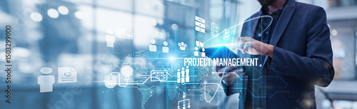 Businessman using tablet analyzing Project Management and growth strategies, risk management, resource allocation, timeline tracking, and stakeholder engagement to ensure successful project delivery.