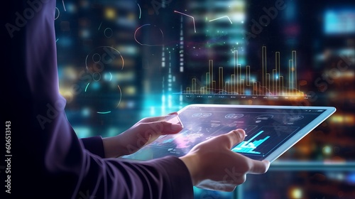 Businessman using tablet analyzing sales data and economic growth graph chart, Technology and icon customer global network connection, Business strategy, Innovative, Digital marketing