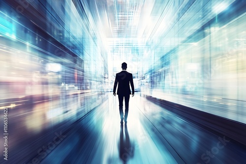 Businessman walking through a futuristic tunnel. Concept of leadership, innovation, and progress.