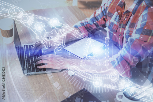 Businessman with computer background with technology theme hologram. Concept of big data. Double exposure.