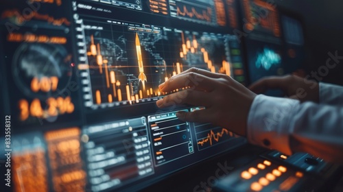 Businessman with digital interface with rocket startup, graph, diagram. Dark background