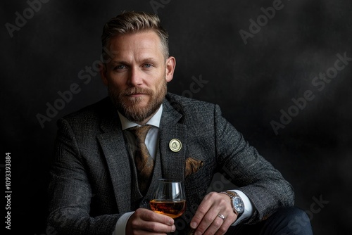 Businessman with glass of whiskey and cigar on dark background generative ai