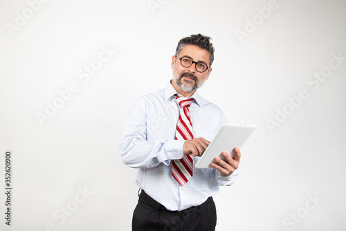 Businessman with glasses is using a digital tablet and smiling, isolated on white background. Looking to the camera