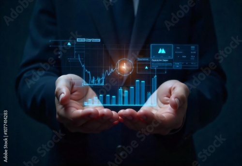 Businessman with hand on touchscreen tablet analyzing data on chart
