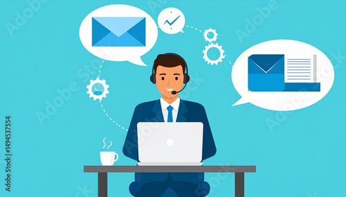 businessman with laptop. Man sitting in front of desk with headset and talking with client. Businessman working.