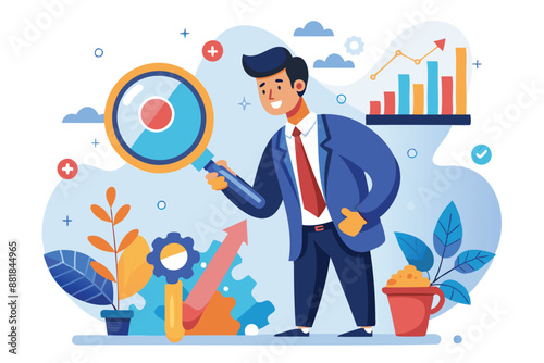 Businessman with Magnifying Glass Analyzing Long Tail Keywords, Representing Niche Market SEO Strategy