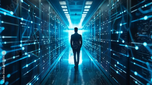 Businessman with virtual cyber security technology and online data protection for security of data storage used by global business network server to secure cyber information