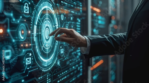 Businessman with virtual cyber security technology and online data protection for security of data storage used by global business network server to secure cyber information