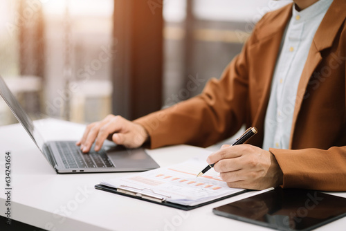 Businessman working at office with laptop and documents on his desk, financial adviser analyzing data.