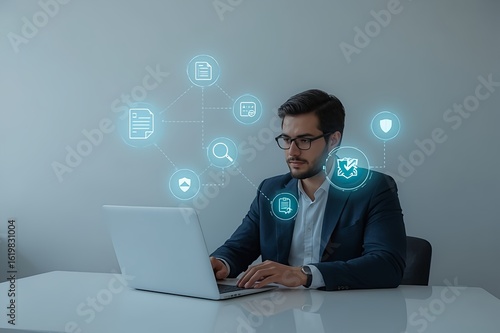 Businessman working on a laptop. Automated data and invoice processing document concept.