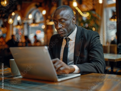 Businessman working on a laptop in a cozy cafe with warm lighting and blurred background
