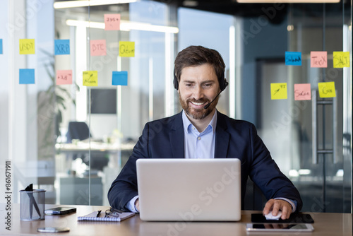 Businessman working on laptop with headset in modern office environment. Professional workspace with sticky notes on glass wall and modern furnishings. Man engaged in remote work or virtual meeting