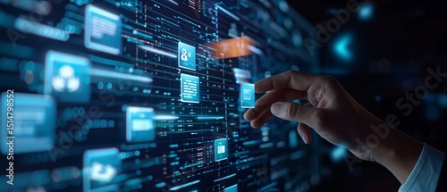 Businessman working with digital documents on virtual screen, document management system (DMS) document database Virtual screen automation software to archive and manage data efficiently