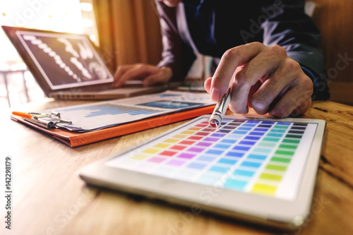 businessman working with digital tablet computer and smart phone with financial business strategy layer effect on desk in morning light