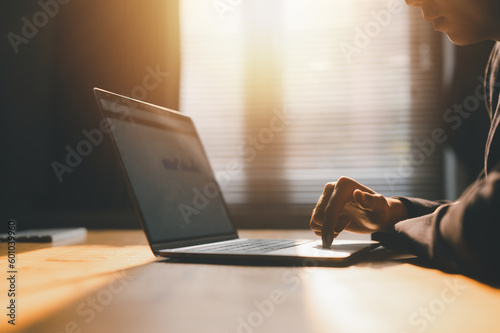 businessman working with laptop at table indoors, closeup