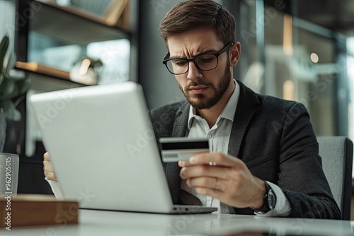 businessman worried about credit card and mobile phone problem, sitting in office at desk
