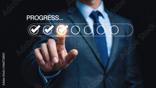 Businessman's finger activating progress bar with completed tasks, marking success and achievement